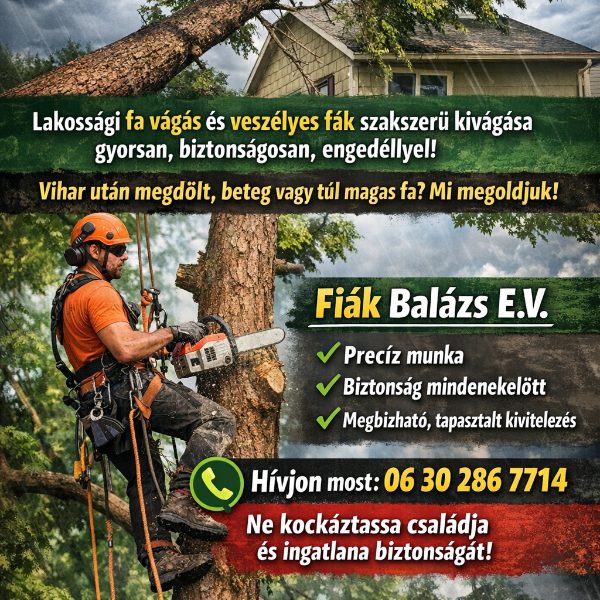 Zöldterület karbantartás és fakivágás – Fiák Balázs E.V. Vállalom kertek, telkek és ipari területek szakszerű gondozását az alábbi szolgáltatásokkal: ✅ Fűnyírás, fűkaszálás ✅ Veszélyes fák szakszerű kivágása ✅ Bozótirtás, telektisztítás ✅ Gallyazás Már most foglalhatóak időpontok a 2026-os évre! Kérjen ingyenes ajánlatot még ma, és biztosítsa helyét a naptáramban!