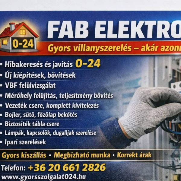 ⚡ Villanyszerelés – teljes körű megoldások egy kézben ⚡ Szabványos mérőhelyek kialakítását és teljesítménybővítést vállalunk, a teljes ügyintézést átvállaljuk a megrendelőtől. Nem kell sorban állni, papírokkal bajlódni – mindent elintézünk helyetted ✔️ Szolgáltatásaink: Szabványos mérőhely építés Teljesítménybővítés, mérőhely átalakítás Lakások és családi házak teljes villamos hálózatának kiépítése Meglévő hálózat javítása, bővítése, átalakítása Hibakeresés, javítás ⚙️ Megbízható munkavégzés, szabvány szerint, korrekt áron. Ha biztos megoldást szeretnél, jó helyen jársz ⚡ 📞06206612826 📧 fabelektro@gmail.com Keress bizalommal!