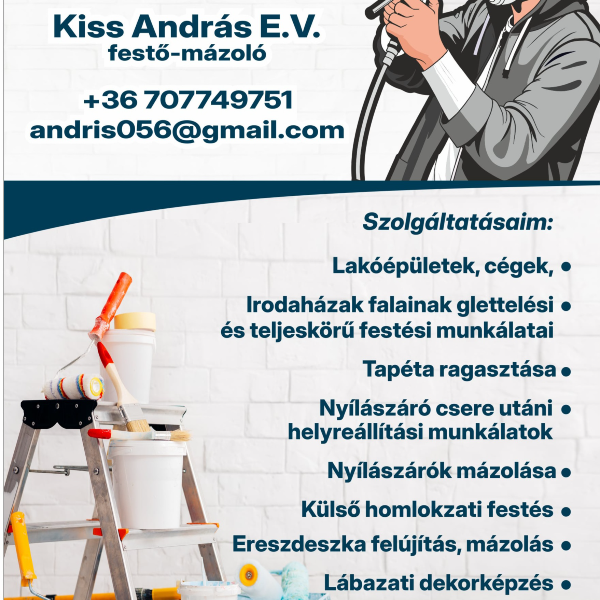 Üdvözlöm! Kiss András a nevem festő-mázoló egyéni vállalkozóként dolgozom Hajdú-Bihar vármegyében. 26 év tapasztalattal vállalok családi házak,lakások teljes körű külső es belső festését -mázolását magánszemélyeknek és cégeknek egyaránt! Ingyenes helyszíni felmérés és árajánlat készítés rövid határidővel!