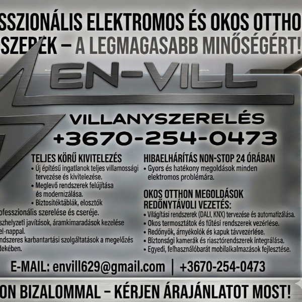 Villanyt szerelni sokan tudnak, de a biztonságot és a szakértelmet a 21 évnyi rutin adja. Az EN-VILL-nél nemcsak drótokat húzunk, hanem kényelmes és biztonságos otthonokat teremtünk. Non-stop hibaelhárítással és okosotthon megoldásokkal (távoli redőnyvezérlés, intelligens fűtés) állok az Ön rendelkezésére. Keressen bizalommal, és tervezzük meg együtt otthona elektromos hálózatát a mai kor igényeire szabva!